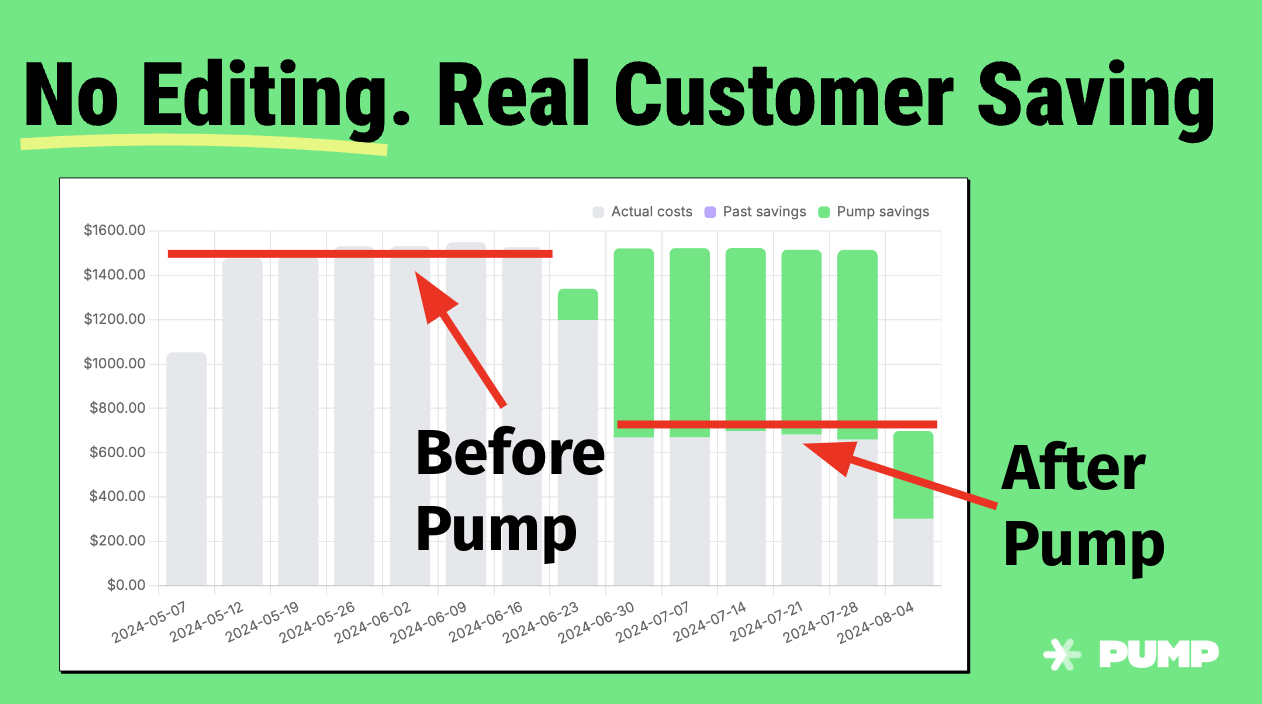This is a real customer that was spending \~$6500 before they joined Pump. When they joined Pump, it took a few days, and then by their first full month with Pump, they spent under $3,000! (you read that right, all thanks to Pump)